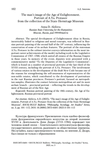 Особое развитие идей Просвещения в России, неразрывно связанное с религиозно-нравственными понятиями, нашло отражение в отечественной портретной живописи второй половины XVIII в., повлияв на консервацию некоторых ее архаичных черт. Портрет государственного деятеля А. Я. Протасова в кабинетном интерьере сообщает о важнейших карьерных достижениях модели, среди которых работа в Уложенной комиссии 1767–1768 гг., объединившей в те годы все сословия Российской империи. В память об этом событии депутатам вручалась памятная медаль «Депутатам уложенной комиссии», которая обнаруживается на целом ряде провинциальных портретов последней трети XVIII в., в том числе и на портрете А. Я. Протасова. Вовлеченность различных сословий в разработку проекта Нового уложения стала одной из причин укрепления самосознания представителей незнатных сословий, что способствовало развитию портретной живописи на просторах русской провинции. Портрет Протасова, ориентированный на столичные образцы, иллюстрирует соприкосновение столичного искусства и его более архаичной ветви – провинциального портрета – являясь отражением тенденций развития русского искусства Нового времени.