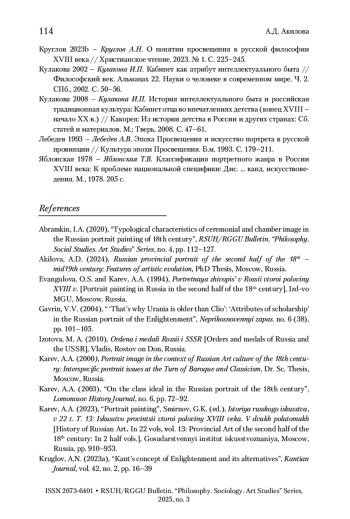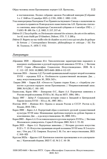 1. Абрамкин 2020 - Абрамкин И.А. Типологические характеристики парадного и камерного изображения в русской портретной живописи XVIII в. // Вестник РГГУ. Серия «Философия. Социология. Искусствоведение». 2020. № 4. С. 112-127. https://doi.org/10.28995/2073-6401-2020-4-112-127.