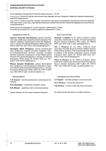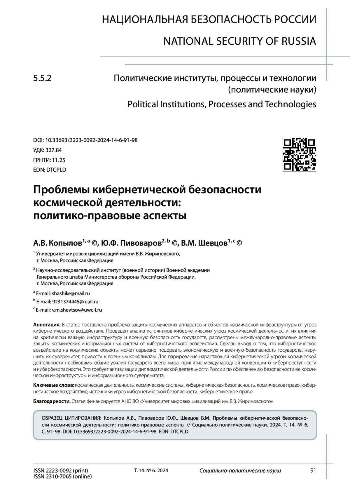 КОПЫЛОВ А. В., ПИВОВАРОВ Ю. Ф., ШЕВЦОВ В. М. ПРОБЛЕМЫ КИБЕРНЕТИЧЕСКОЙ БЕЗОПАСНОСТИ КОСМИЧЕСКОЙ ДЕЯТЕЛЬНОСТИ: ПОЛИТИКО-ПРАВОВЫЕ АСПЕКТЫ // СОЦИАЛЬНО-ПОЛИТИЧЕСКИЕ НАУКИ. 2024. Т. 14 № 6