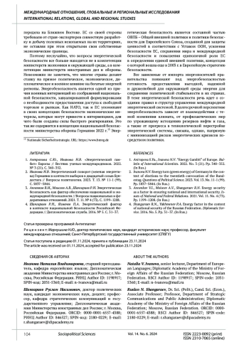 1. Антропова С.Ю., Иванова Н.В. “Энергетический гамбит” Европы // Вестник ученых-международников. 2022. № 3 (21). С. 340-352. EDN: JWTLEB