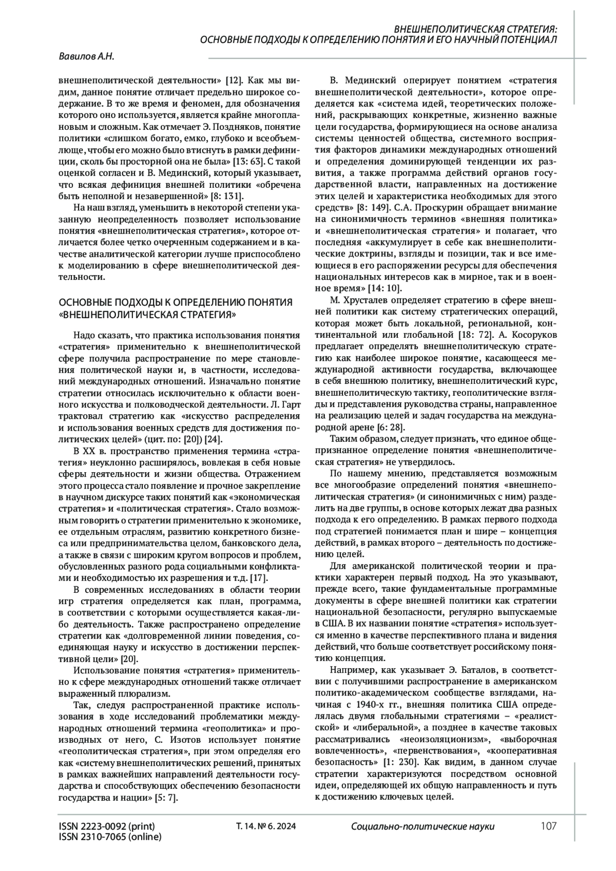 ВАВИЛОВ А. Н. ВНЕШНЕПОЛИТИЧЕСКАЯ СТРАТЕГИЯ: ОСНОВНЫЕ ПОДХОДЫ К ОПРЕДЕЛЕНИЮ ПОНЯТИЯ И ЕГО НАУЧНЫЙ ПОТЕНЦИАЛ // СОЦИАЛЬНО-ПОЛИТИЧЕСКИЕ НАУКИ. 2024. Т. 14 № 6
