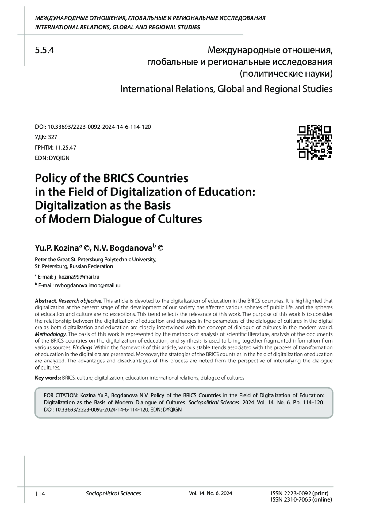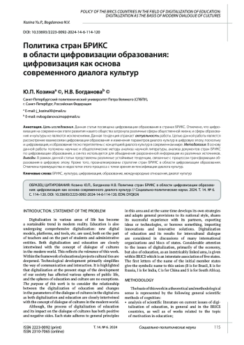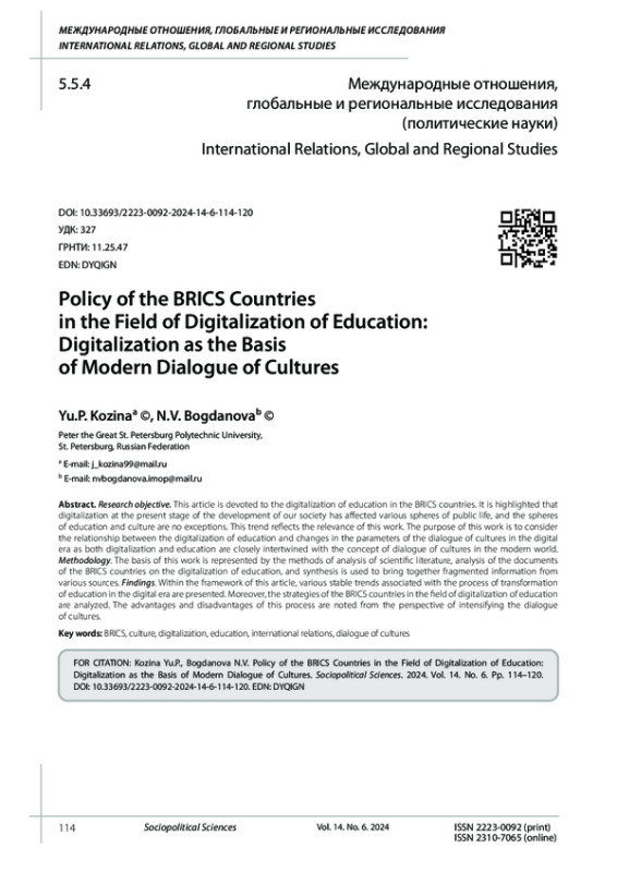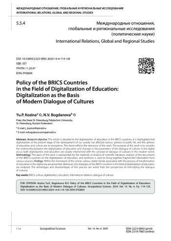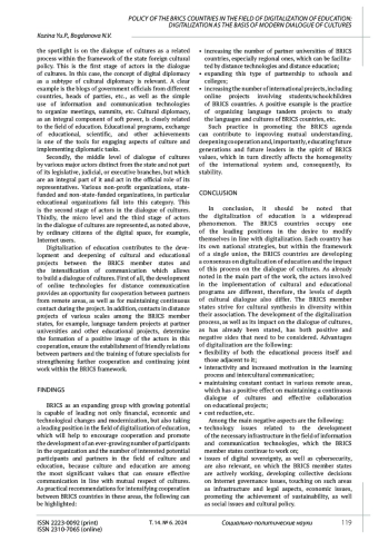 Цель исследования. Данная статья посвящена цифровизации образования в странах БРИКС. Отмечено, что цифровизация на современном этапе развития нашего общества затронула различные сферы общественной жизни, и сферы образования и культуры не являются исключениями. Данная тенденция отражает актуальность работы. Целью данной работы является рассмотрение взаимосвязи цифровизации образования и изменения параметров диалога культур в цифровую эпоху, поскольку и цифровизация, и образование тесно переплетены с концепцией диалога культур в современном мире. Методология. В основу данной работы положены научные и общелогические методы анализа научной литературы, анализа документов стран БРИКС по цифровизации образования, а синтез используется для объединения разрозненной информации из различных источников. Выводы. В рамках данной статьи представлены различные устойчивые тенденции, связанные с процессом трансформации образования в цифровую эпоху. Кроме того, проанализированы стратегии стран БРИКС в области цифровизации образования. Отмечены преимущества и недостатки этого процесса с точки зрения интенсификации диалога культур.