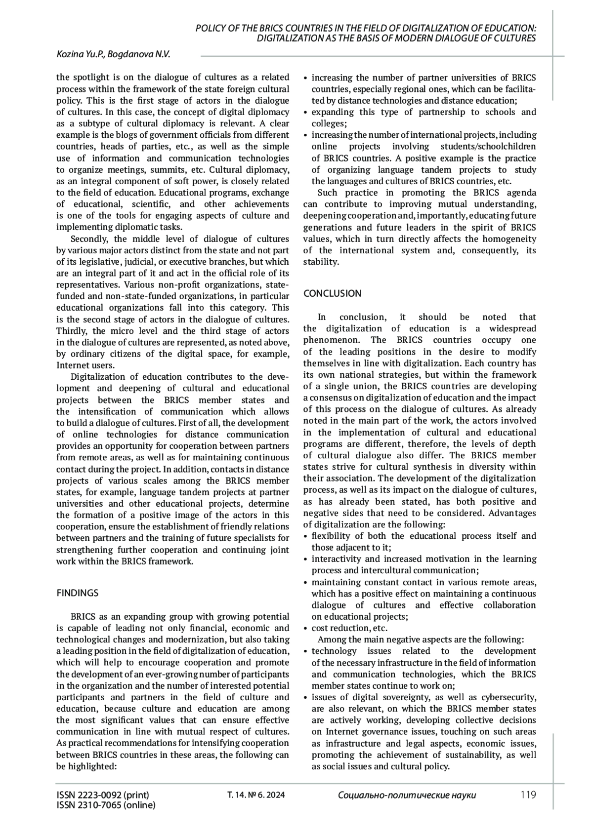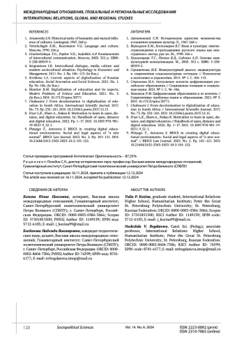9. Pletyago T., Antonova S. BRICS in creating digital educational environments: Social and legal aspects of “a new normal”. BRICS Law Journal. 2023. No. 2. Рp. 101-121. DOI: 10.21684/2412-2343-2023-10-2-101-122 EDN: PDTVZT