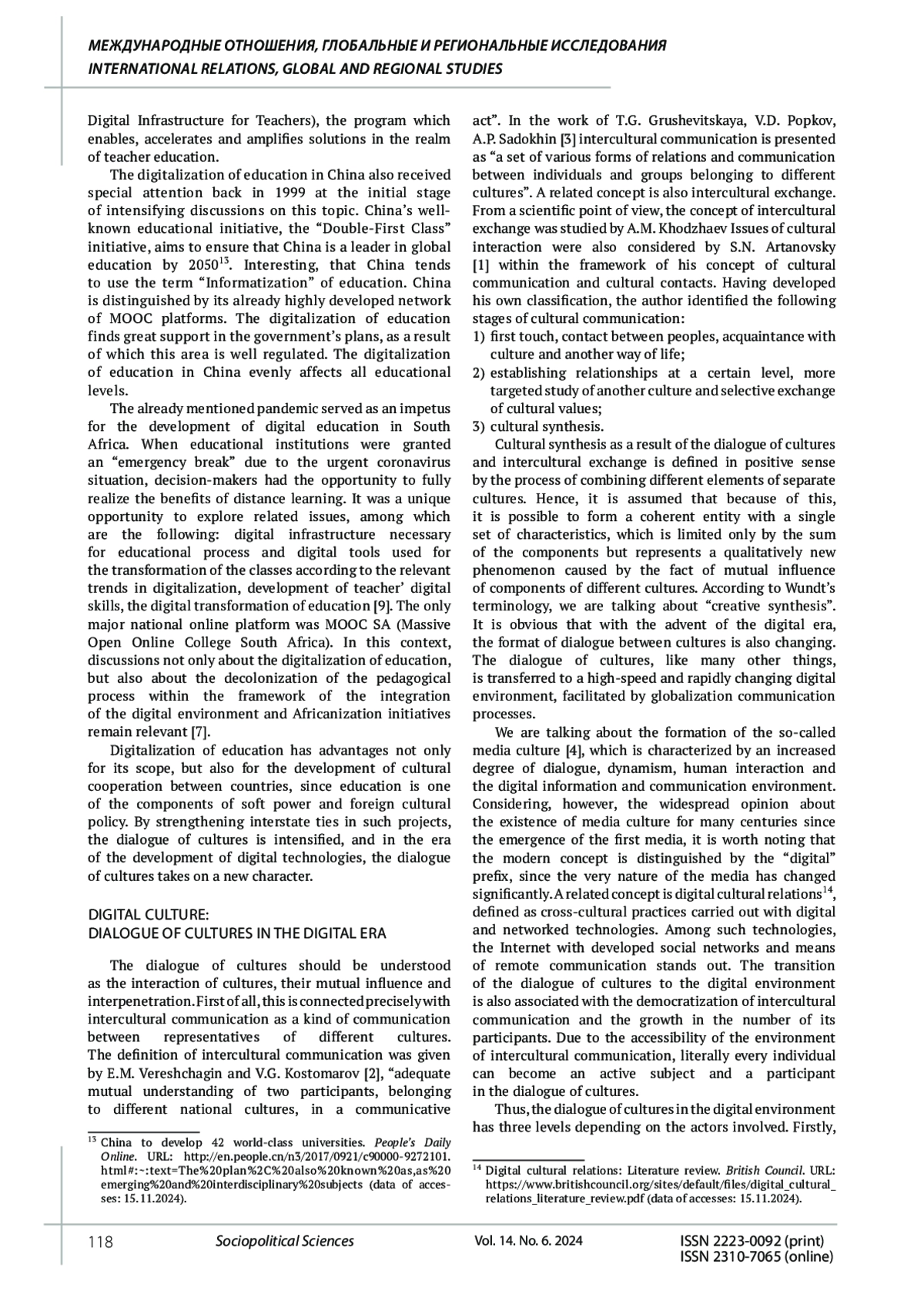 4. Сержантова И.Б. Межкультурный диалог, медиакультура и современная социокультурная ситуация // Психология в экономике и управлении. 2011. № 1. С. 106-113. EDN: STELVV