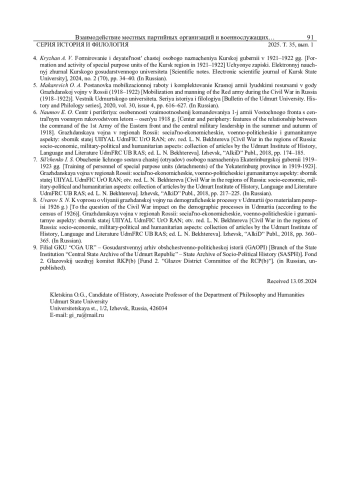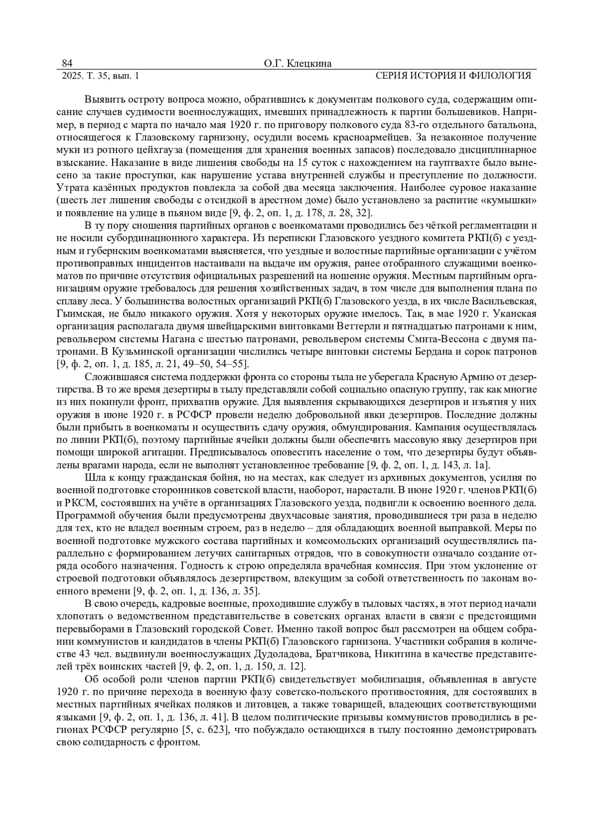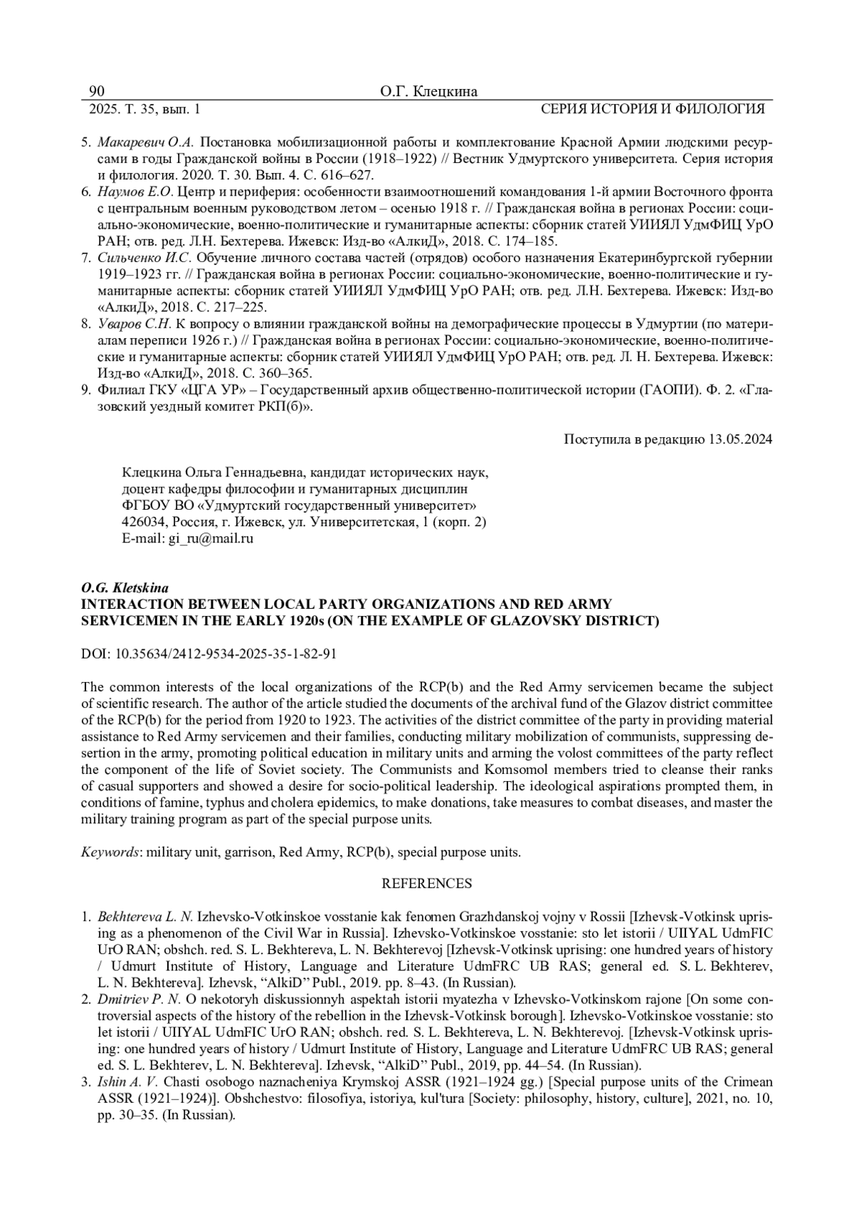 КЛЕЦКИНА О. Г. ВЗАИМОДЕЙСТВИЕ МЕСТНЫХ ПАРТИЙНЫХ ОРГАНИЗАЦИЙ И ВОЕННОСЛУЖАЩИХ КРАСНОЙ АРМИИ В НАЧАЛЕ 1920-Х ГОДОВ (НА ПРИМЕРЕ ГЛАЗОВСКОГО УЕЗДА) // ВЕСТНИК УДМУРТСКОГО УНИВЕРСИТЕТА. СЕРИЯ: ИСТОРИЯ И ФИЛОЛОГИЯ. 2025. Т. 35 № 1