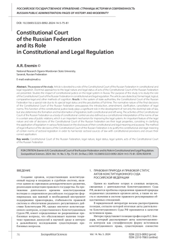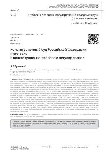 Цель исследования. Статья посвящена роли Конституционного Суда РФ в конституционно-правовом регулировании. Представляются доктринальные подходы к правовой природе и правовому статусу актов Конституционного Суда РФ. Изучается воздействие конституционной юстиции на правовую систему в России. Целью исследования является изучение роли Конституционного Суда РФ в конституционно-правовом регулировании. В статье используются диалектический, формально-юридический, логический, сравнительно-правовой и другие методы познания. Выводы. В системе органов государственной власти Конституционный Суд РФ занимает особую роль в силу его особого правового статуса и особенностей полномочий. Нормативность итоговых решений Конституционного Суда РФ предполагает введение в действие, изменение, уточнение, отмену норм права. Данная функция органа конституционной юстиции играет значительную роль в развитии не только доктринальной стороны права, но и определяет формирование и преобразование законодательства как конституционного, так и отраслевого. Деятельность Конституционного Суда РФ как органа конституционного контроля также определяется как конституционное толкование норм законодательства в определенной сфере общественных отношений, что представляет собой важный механизм совершенствования правовой системы. Важной особенностью юридической природы и роли решений Конституционного Суда РФ являются их правопреобразующие свойства, состоящие в уточнении правоприменения норм законодательства различных сфер на основе раскрытия их конституционно-правового смысла и назначения. Способом правопреобразующего воздействия решений Конституционного Суда РФ является обоснование конституционно-правового смысла отдельных норм отраслевого законодательства с целью гармонизации отраслевых источников права с конституционными положениями и обеспечения правильного их применения.