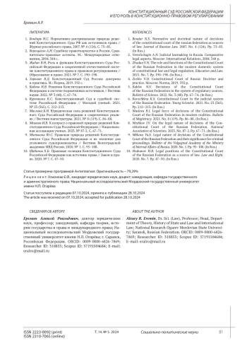 3. Жадан В.Н. Роль и функции Конституционного Суда Российской Федерации в современной отечественной системе конституционного права и правовом регулировании // Образование и право. 2021. № 7. С. 190-198. EDN: AFNCUF