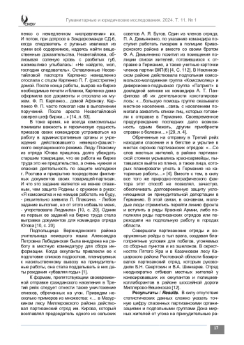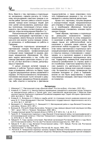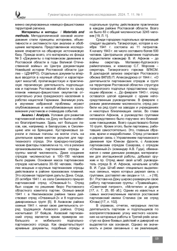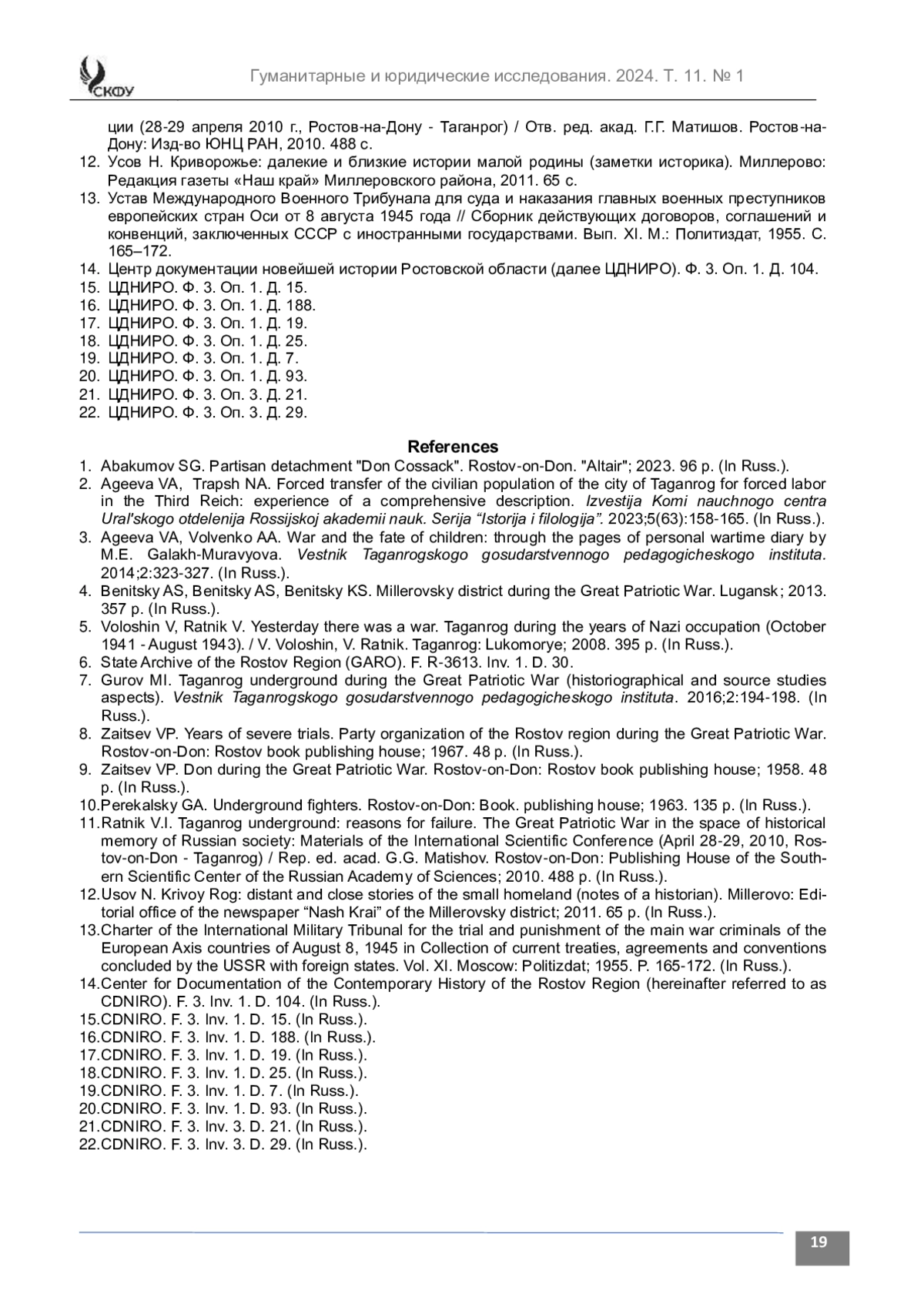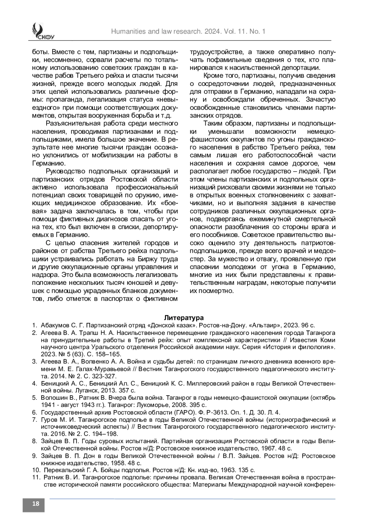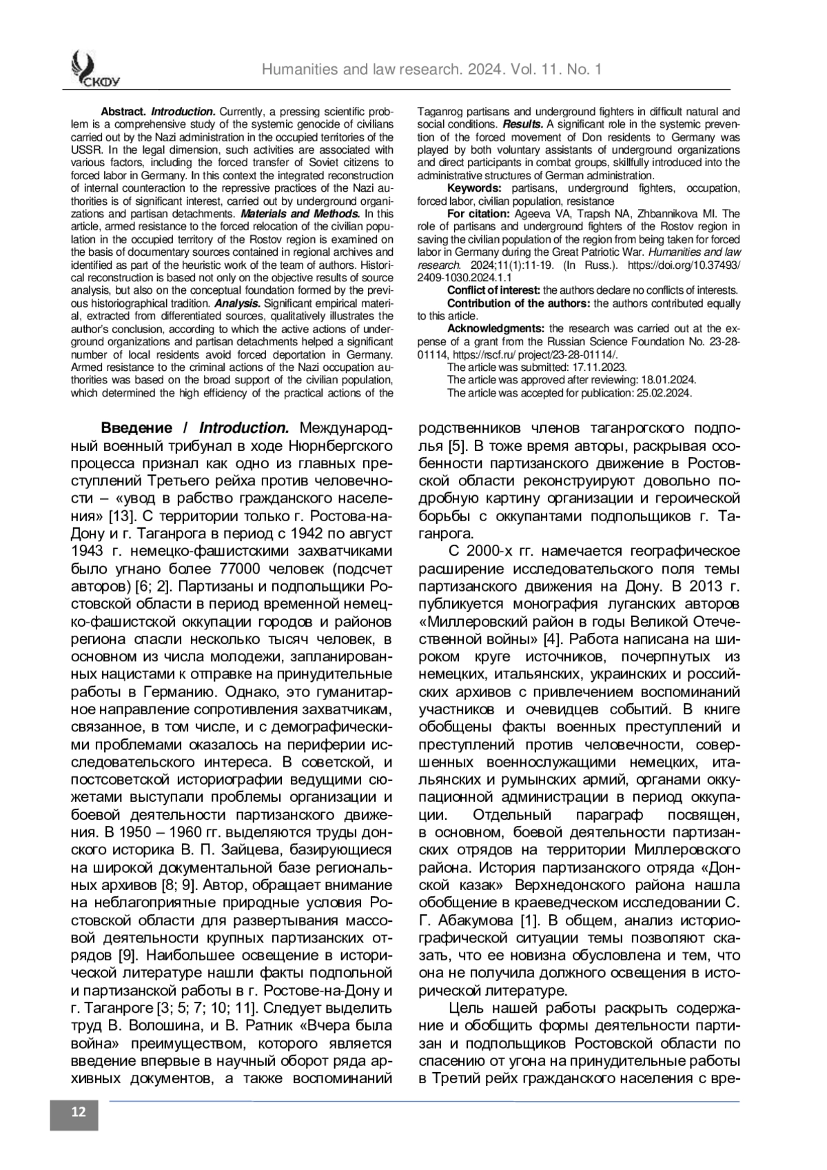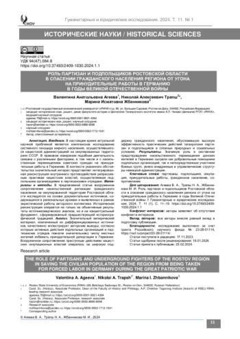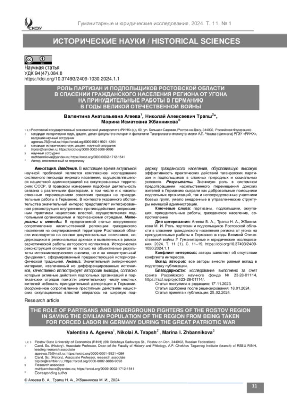 АГЕЕВА В. А., ТРАПШ Н. А., ЖБАННИКОВА М. И. РОЛЬ ПАРТИЗАН И ПОДПОЛЬЩИКОВ РОСТОВСКОЙ ОБЛАСТИ В СПАСЕНИИ ГРАЖДАНСКОГО НАСЕЛЕНИЯ РЕГИОНА ОТ УГОНА НА ПРИНУДИТЕЛЬНЫЕ РАБОТЫ В ГЕРМАНИЮ В ГОДЫ ВЕЛИКОЙ ОТЕЧЕСТВЕННОЙ ВОЙНЫ // ГУМАНИТАРНЫЕ И ЮРИДИЧЕСКИЕ ИССЛЕДОВАНИЯ. 2024. ТОМ 11, № 1