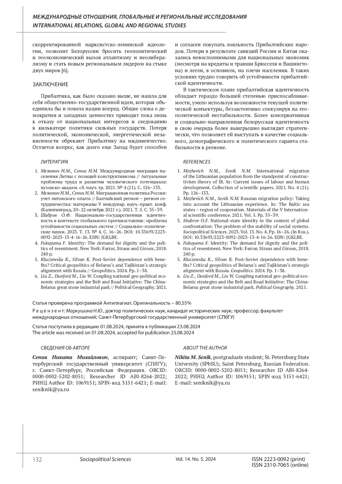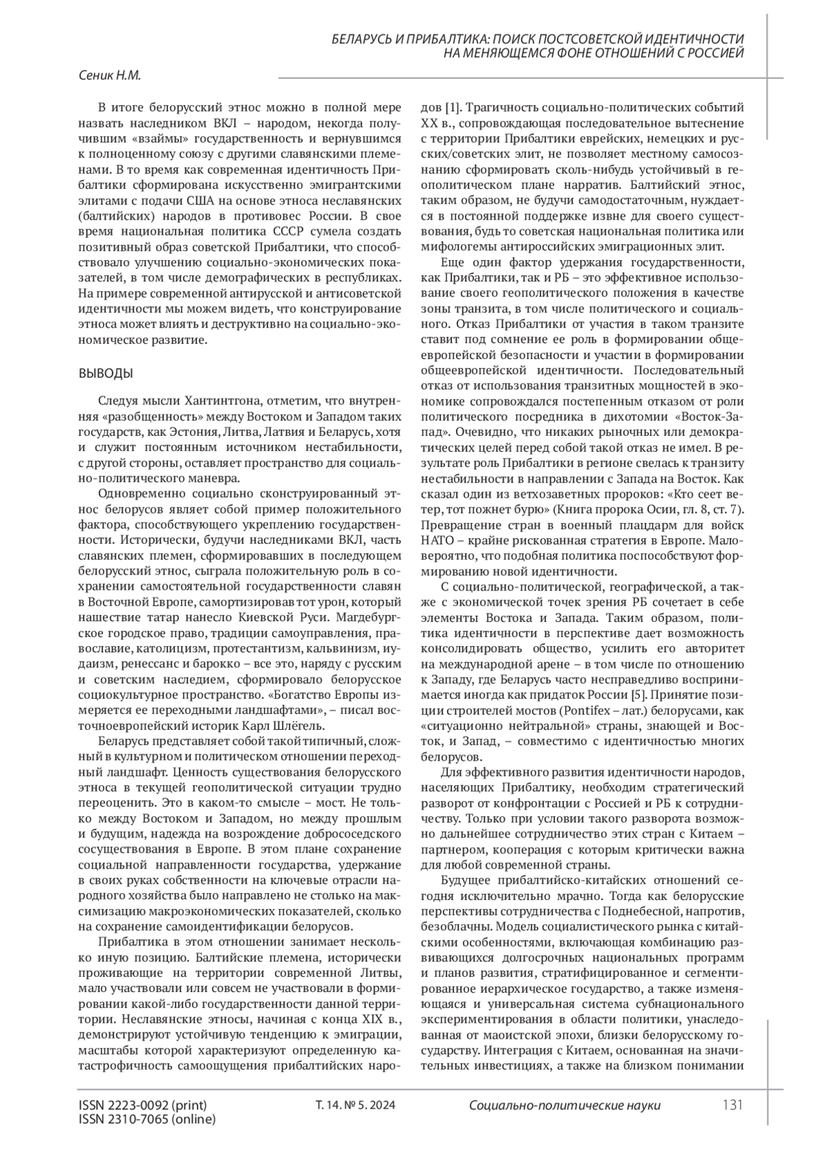 5. Kluczewska K., Silvan K. Post-Soviet dependence with benefits? Critical geopolitics of Belarus’s and Tajikistan’s strategic alignment with Russia. Geopolitics. 2024. Pp. 1-38.