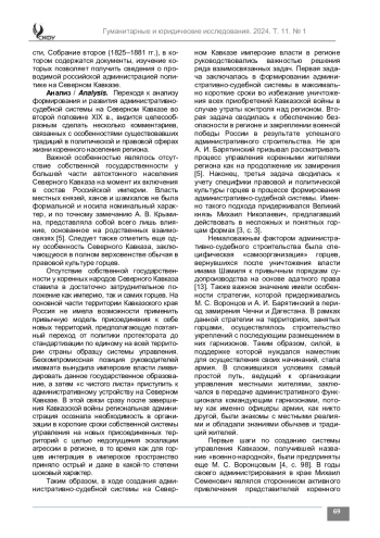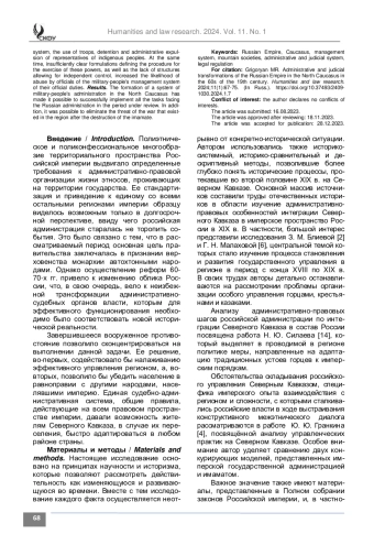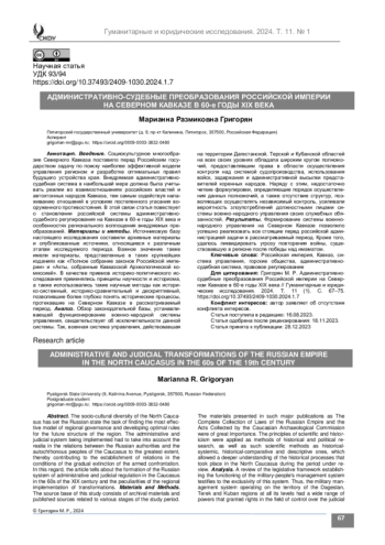 Введение. Социокультурное многообразие Северного Кавказа поставило перед Российским государством задачу по поиску наиболее эффективной модели управления регионом и разработке оптимальных правил будущего устройства края. Внедряемая административно-судебная система в наибольшей мере должна была учитывать реалии во взаимоотношениях российских властей и автохтонных народов Кавказа, тем самым содействуя налаживанию отношений в условиях постепенного угасания вооруженного противостояния. В этой связи статья повествует о становлении российской системы административно-судебного регулирования на Кавказе в 60-е годы XIX века и особенностях регионального воплощения внедряемых преобразований.