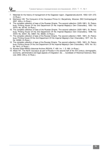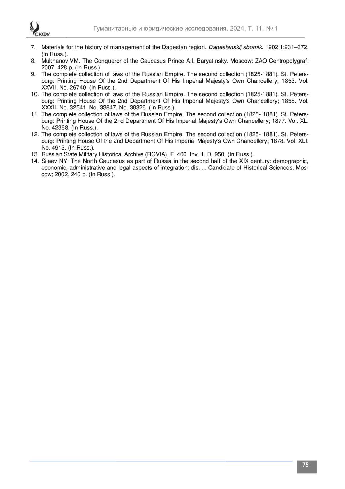 14. Силаев Н. Ю. Северный Кавказ в составе России во второй половине XIX в.: демографические, экономические, административно-правовые аспекты интеграции: дис. … канд. ист. наук. М., 2002. 240 с.