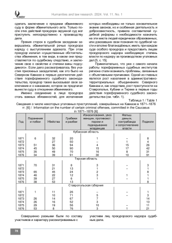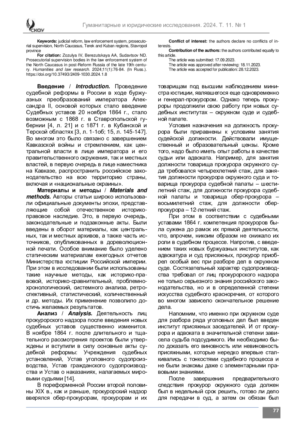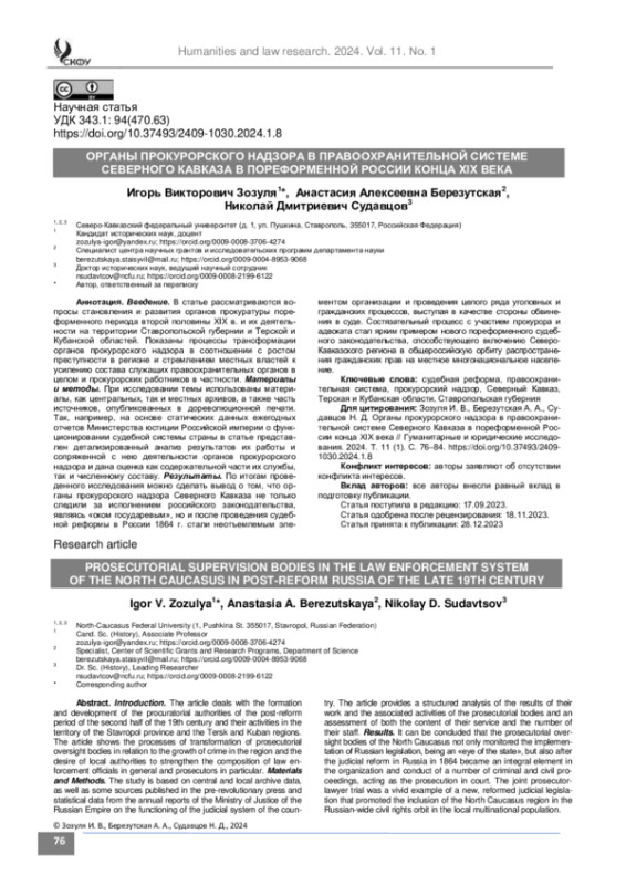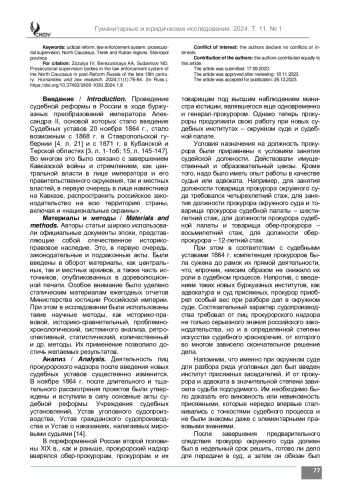 Результаты. По итогам проведенного исследования можно сделать вывод о том, что органы прокурорского надзора Северного Кавказа не только следили за исполнением российского законодательства, являясь «оком государевым», но и после проведения судебной реформы в России 1864 г. стали неотъемлемым элементом организации и проведения целого ряда уголовных и гражданских процессов, выступая в качестве стороны обвинения в суде. Состязательный процесс с участием прокурора и адвоката стал ярким примером нового пореформенного судебного законодательства, способствующего включению Северо-Кавказского региона в общероссийскую орбиту распространения гражданских прав на местное многонациональное население.
