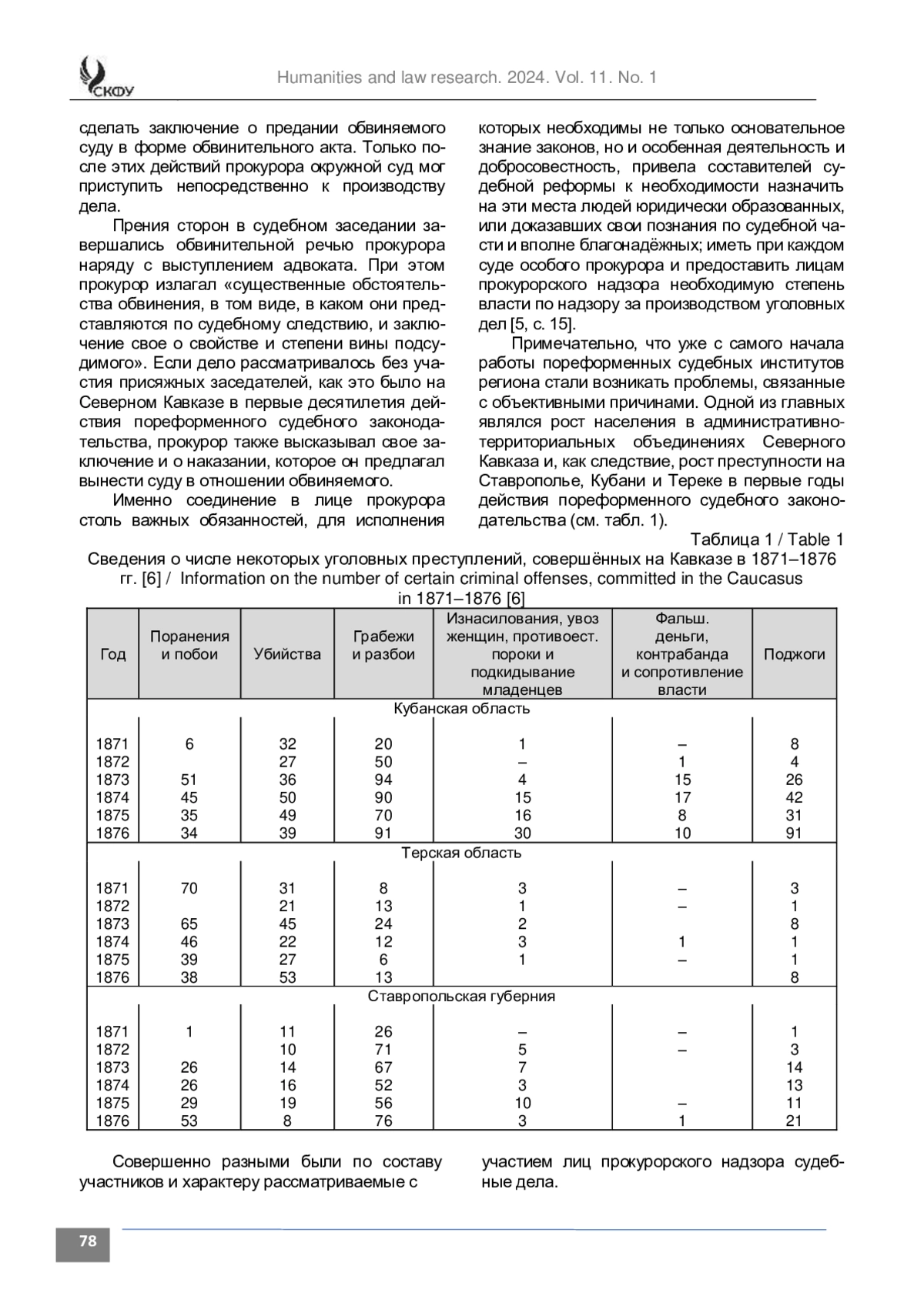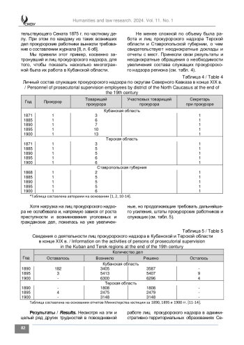 Введение. В статье рассматриваются вопросы становления и развития органов прокуратуры пореформенного периода второй половины XIX в. и их деятельности на территории Ставропольской губернии и Терской и Кубанской областей. Показаны процессы трансформации органов прокурорского надзора в соотношении с ростом преступности в регионе и стремлением местных властей к усилению состава служащих правоохранительных органов в целом и прокурорских работников в частности.