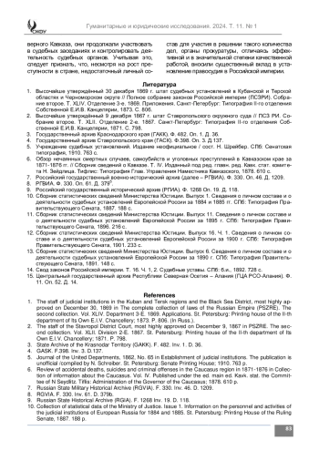 Введение. Социокультурное многообразие Северного Кавказа поставило перед Российским государством задачу по поиску наиболее эффективной модели управления регионом и разработке оптимальных правил будущего устройства края. Внедряемая административно-судебная система в наибольшей мере должна была учитывать реалии во взаимоотношениях российских властей и автохтонных народов Кавказа, тем самым содействуя налаживанию отношений в условиях постепенного угасания вооруженного противостояния. В этой связи статья повествует о становлении российской системы административно-судебного регулирования на Кавказе в 60-е годы XIX века и особенностях регионального воплощения внедряемых преобразований.