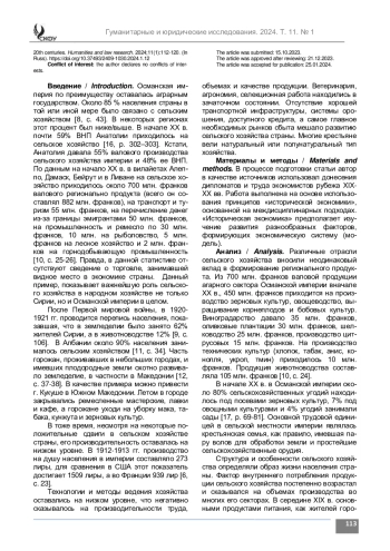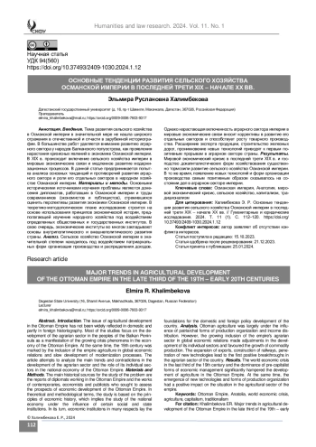 Введение. Тема развития сельского хозяйства в Османской империи в значительной мере не нашла широкого отражения в отечественной и отчасти в зарубежной историографии. В большинстве работ уделяется внимание развитию аграрного сектора у народов Балканского полуострова, как проявления нарастания кризисных явлений в экономике Османской империи. В XIX в. происходит включение сельского хозяйства империи в мировые экономические связи и медленное развитие модернизационных процессов. В данной статье предпринимается попытка анализа основных тенденций и противоречий развития аграрного сектора и роли его отдельных секторов в народном хозяйстве Османской империи.