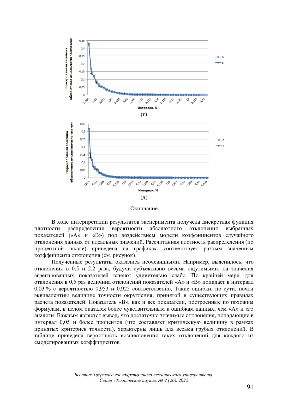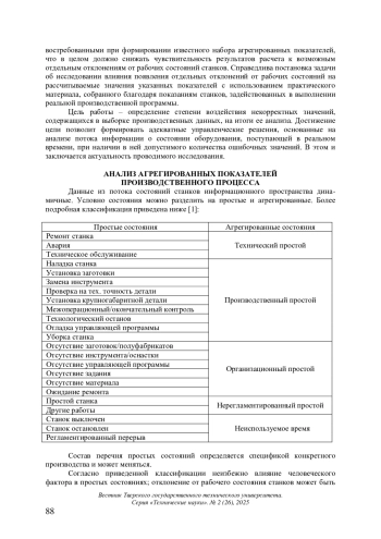 Статья посвящена исследованию воздействия частоты появления отклонений от рабочих состояний станков на значения агрегированных показателей средствами компьютерного моделирования. Подчеркнуто, что результаты расчетов показывают: даже несколько серьезных отклонений не могут существенно повлиять на точность расчета агрегированных показателей