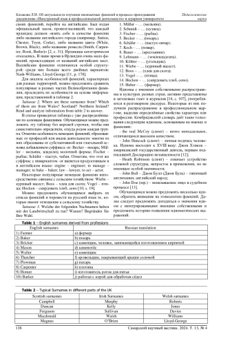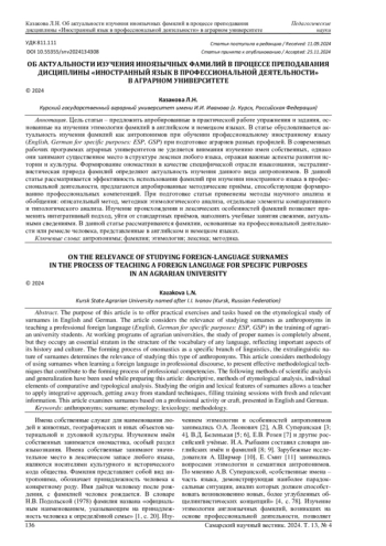 Статья: ОБ АКТУАЛЬНОСТИ ИЗУЧЕНИЯ ИНОЯЗЫЧНЫХ ФАМИЛИЙ В ПРОЦЕССЕ ПРЕПОДАВАНИЯ ДИСЦИПЛИНЫ «ИНОСТРАННЫЙ ЯЗЫК В ПРОФЕССИОНАЛЬНОЙ ДЕЯТЕЛЬНОСТИ» В АГРАРНОМ УНИВЕРСИТЕТЕ (2024)