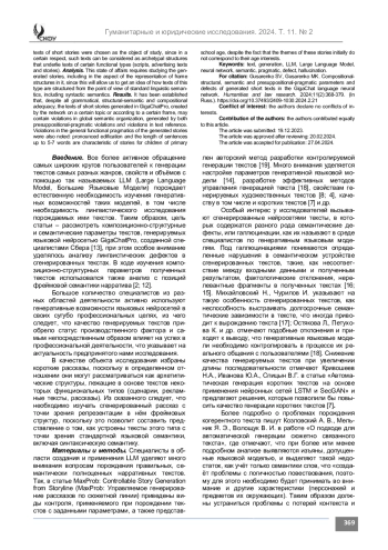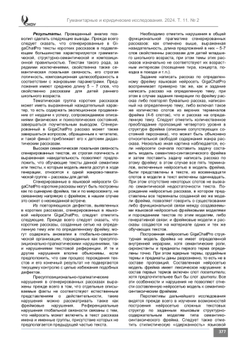 Результаты. Установлено, что при всей грамматической, структурно-семантической и композиционной адекватности, сгенерированные в GigaChatPro тексты коротких рассказов, созданные сетью на определенную тему или по определенному фрейму, могут содержать нарушения в глобально-семантической организации, порожденные как пресуппозициональнопрагматическими нарушениями, так и нарушениями текстовой референции. Отмечены также нарушения в общей функциональной прагматике сгенерированных рассказов: выраженная назидательность, длина предложений в них – 5-7 слов свойственны рассказам для детей младшего школьного возраста, при том, что темы этих рассказов изначально не соответствуют их возрастным интересам.
