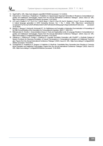 15. Ji Z., Lee N., Frieske R., Yu T., Su D., Xu Y., Ishii E., Bang Y., Chen D., Chan H.S., Dai W., Madotto A., Fung P. Survey of hallucination in natural language generation // ACM Computing Surveys. Vol. 1. No. 1. Article. URL: https://www.semanticscholar.org/search?q=Survey%20of%20hallucination%20in%20natural%20%generation&sort=r=relevance (accessed: 15.02.2023)