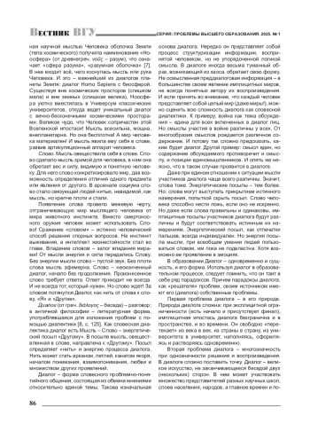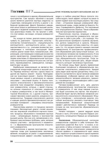 В статье затрагивается тема диалога в образовательном пространстве классического университета. Подчеркивается, что диалогизм образовательного процесса - это одна из традиций отечественного университетского образования, заложенная основателями Московского государственного университета. В статье обсуждаются понятие диалога и сложности самого процесса. Дается обобщенная характеристика проблемы диалога в высшей школе. Излагаются взгляды автора на проблему. В заключение раскрывается полифонизм диалога в образовательном пространстве университетов.