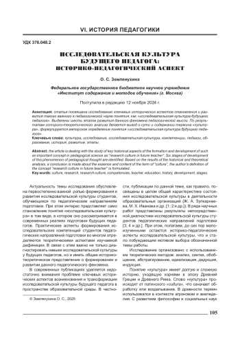 Статья посвящена исследованию ключевых исторических аспектов становления и развития такого важного в педагогической науке понятия, как «исследовательская культура будущего педагога». Выделены шесть этапов развития данного феномена педагогической мысли. По результатам историко-теоретического анализа делается вывод о сути и содержании термина «культура», формулируется авторское определение понятия «исследовательская культура будущего педагога».
