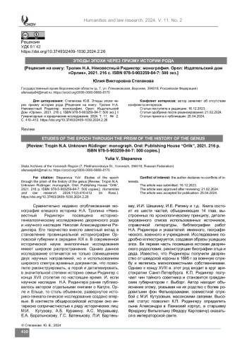Для цитирования: Степанова Ю. В. Этюды эпохи через призму истории рода [Рецензия на книгу: Тропин Н. А. Неизвестный Ридингер: монография. Орел: Издательский Дом «Орлик», 2021. 216 с. ISBN 978-5-903259-84-7: 500 экз.]. Гуманитарные и юридические исследования. 2024;11(2):410-412. https://doi. org/10.37493/2409-1030.2024.2.26