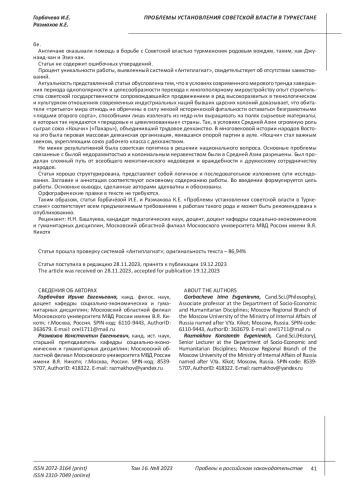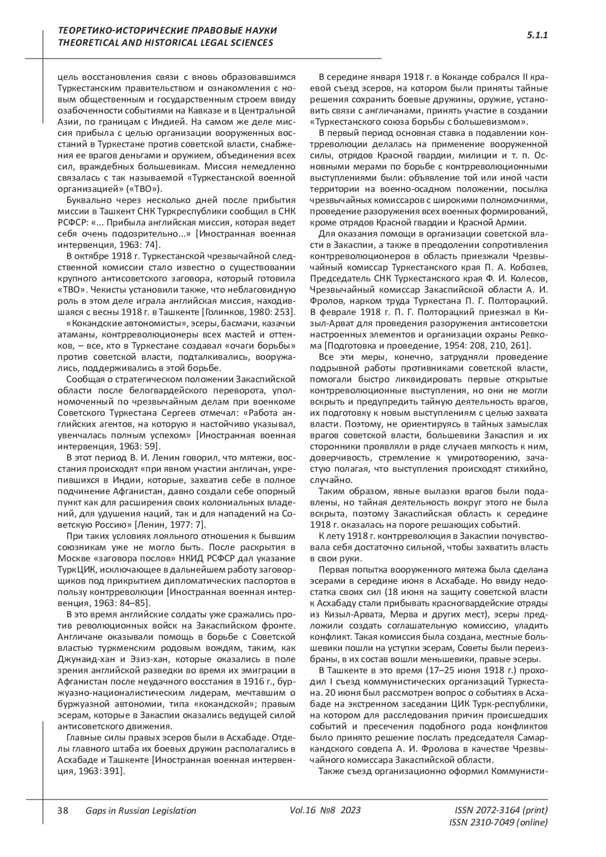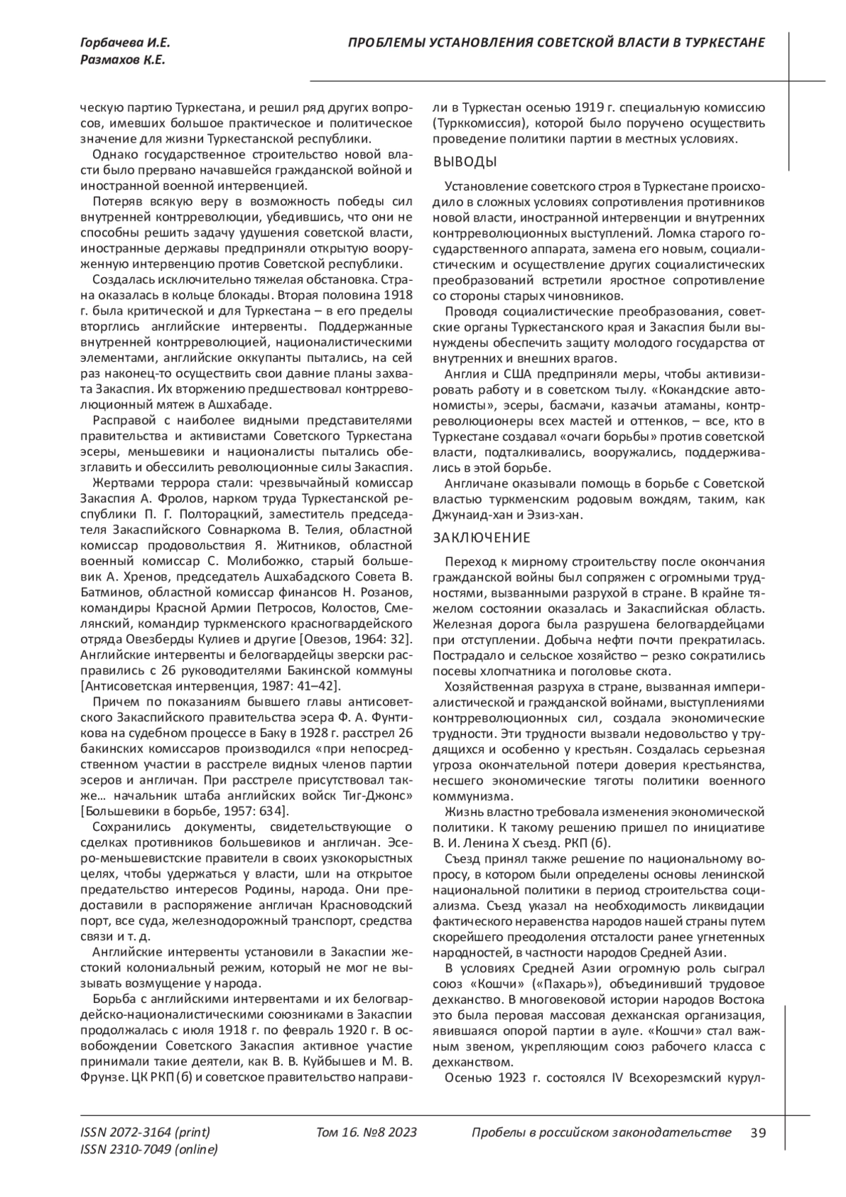 ГОРБАЧЕВА И. Е., РАЗМАХОВ К. Е. ПРОБЛЕМЫ УСТАНОВЛЕНИЯ СОВЕТСКОЙ ВЛАСТИ В ТУРКЕСТАНЕ // ПРОБЕЛЫ В РОССИЙСКОМ ЗАКОНОДАТЕЛЬСТВЕ. 2023. Т. 16 № 8 (36 СТ.)