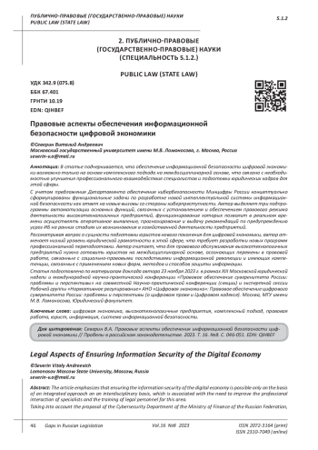 В статье подчеркивается, что обеспечение информационной безопасности цифровой экономики возможно только на основе комплексного подхода на междисциплинарной основе, что связано с необходимостью улучшения профессионального взаимодействия специалистов и подготовки юридических кадров для этой сферы. С учетом предложения Департамента обеспечения кибербезопасности Минцифры России концептуально сформулированы функциональные задачи по разработке новой интеллектуальной системы информационной безопасности как ответ на новые вызовы со стороны киберпреступности. Автор выделяет три подпрограммы автоматизации основных функций, связанных с установлением и обеспечением правового режима деятельности высокотехнологичных предприятий, функционирование которых позволит в реальном времени осуществлять оперативное выявление, прогнозирование и выдачу рекомендаций по предупреждению угроз ИБ на ранних стадиях их возникновения в хозяйственной деятельности предприятий. Рассматривая вопрос о сущности подготовки юристов нового поколения для цифровой экономики, автор отмечает низкий уровень юридической грамотности в этой сфере, что требует разработки новых программ профессиональной переподготовки. Автор считает, что для правового обслуживания высокотехнологичных предприятий нужно готовить юристов на междисциплинарной основе, осознающих перемены в правовой работе, связанные с социально-правовыми последствиями информационной революции и имеющих компетенции, связанные с применением новых форм, методов и способов защиты информации. Статья подготовлена по материалам доклада автора 23 ноября 2023 г. в рамках XIII Московской юридической недели и международной научно-практической конференции «Правовое обеспечение суверенитета России: проблемы и перспективы» на совместной Научно-практической конференции (секции) и экспертной сессии Рабочей группы «Нормативное регулирование» АНО «Цифровая экономика»: Правовое обеспечение цифрового суверенитета России: проблемы и перспективы (о цифровом праве и Цифровом кодексе). Москва, МГУ имени М. В. Ломоносова, Юридический факультет.