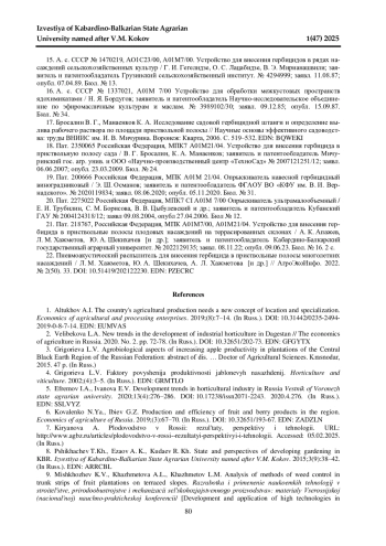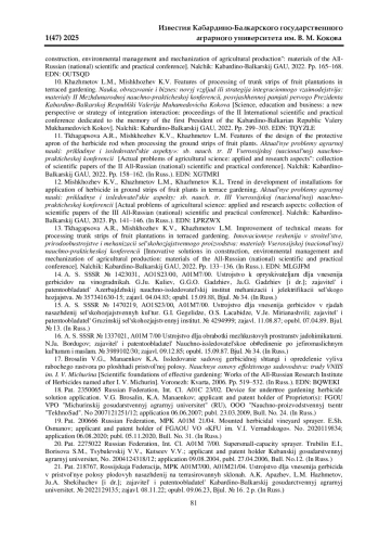 13. Тхагапсова А. Р., Мишхожев К. В., Хажметов Л. М. Совершенствование технических средств для обработки приствольных полос плодовых насаждений в террасном садоводстве // Инновационные решения в строительстве, природообустройстве и механизации сельскохозяйственного производства: материалы Всероссийской (национальной) научно-практической конференции. Нальчик: Кабардино- Балкарский ГАУ, 2022. С. 133-136. EDN: MLGJFM