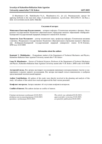 12. Мишхожев К. В., Хажметов Л. М., Хажметов К. Л. Тенденция развития установок для внесения гербицида в приствольные полосы плодовых насаждений в террасном садоводстве // Актуальные проблемы аграрной науки: прикладные и исследовательские аспекты: сб. науч. тр. III Всероссийской (национальной) научно-практической конференции. Нальчик: Кабардино-Балкарский ГАУ, 2023. С. 141-146. EDN: LPRZWX