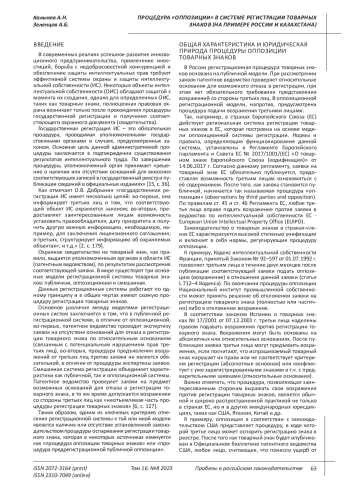Статья посвящена исследованию института возражений на регистрацию товарных знаков, известному как «процедура оппозиции товарных знаков». Данная процедура является одним из механизмов защиты товарного знака в досудебном (административном) порядке. В статье рассматриваются вопросы юридической природы и роль процедуры оппозиции товарных знаков в системе защиты интеллектуальных прав. Исследуются проблемы и особенности становления процедуры подачи и рассмотрения возражений против регистрации товарных знаков в законодательстве России и Казахстана, делается вывод об определенных преимуществах данной процедуры по сравнению с судебной. Процедура заявления возражений позволяет обеспечить защиту интеллектуальных прав, предотвращая незаконную регистрацию товарных знаков еще на этапе рассмотрения заявки. Она является экономически более эффективным способом разрешения конфликтов, поскольку позволяет избежать долгого и затратного судебного процесса.