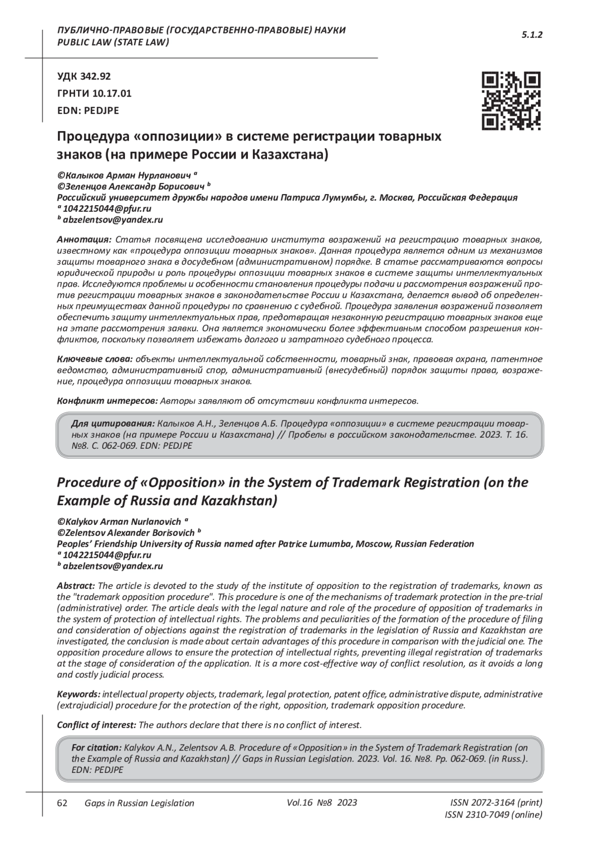 12. Лавринович Р.Д. Прообраз оппозиции при регистрации товарных знаков в Российской Федерации, его особенности и природа // Проблемы права. 2020. № 1 (75). С. 44-47. EDN: KVQRXJ