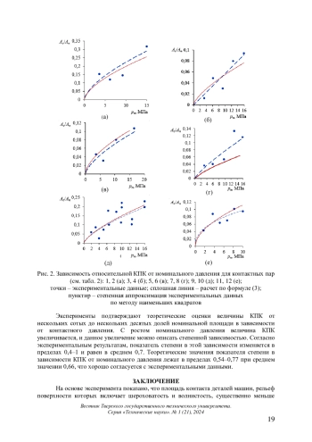 Исследовано влияние волнистости технических поверхностей на контактное взаимодействие деталей машин. Приведены параметры шероховатости и волнистости поверхностей экспериментальных образцов по ГОСТ Р ИСО 4287-2014, механические свойства материалов образцов, дано описание методики эксперимента. Предложены теоретические зависимости контурной площади контакта от номинального давления, параметров шероховатости и волнистости контактирующих поверхностей и механических свойств материалов контактирующих деталей. Теоретически и экспериментально показано, что волнистость существенно влияет на величину площади контакта деталей машин. Отмечено, что в зависимости от величины номинального контактного давления контурная площадь, образовавшаяся в результате упругой деформации волн, составляет от нескольких единиц до нескольких десятков процентов от номинальной площади контакта
