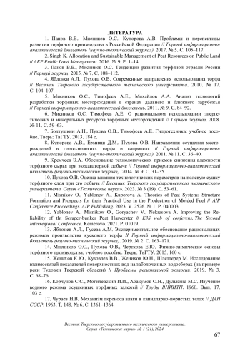 11. Misnikov O., Yablonev A., Kuporova A. Theories of Peat Systems Structure Formation and Prospects for their Practical Use in the Production of Molded Fuel // AIP Conference Proceedings. AIP Publishing. 2023. V. 2526. № 1. P. 040003.
