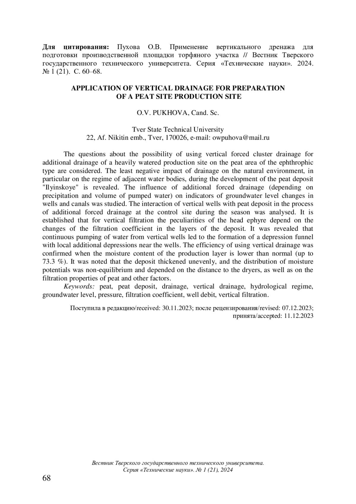 Рассмотрены вопросы о возможности использования вертикального принудительного кустового дренирования для дополнительного осушения сильнообводненной производственной площадки на торфяном участке эфтрофного типа. Выявлено наименьшее отрицательное воздействие дренирования на окружающую природную среду, в частности на режим прилегающих водных объектов, при отработке торфяного месторождения «Ильинское». Изучено влияние дополнительного принудительного осушения (в зависимости от осадков и объема откачанной воды) на показатели изменения уровней грунтовых вод в скважинах и каналах. Проанализировано взаимодействие вертикальных скважин с торфяной залежью в процессе дополнительного принудительного осушения на контрольном участке в течение сезона. Установлено, что для вертикальной фильтрации особенности эпюры напоров зависят от изменений коэффициента фильтрации в слоях залежи. Выявлено, что непрерывная откачка воды из вертикальных скважин привела к образованию депрессионной воронки с местными дополнительными понижениями вблизи скважин. Подтверждена эффективность использования вертикального дренирования при понижении влажности эксплуатационного слоя ниже нормы (до 73,3 %). Отмечено, что по толщине залежь уплотнилась неравномерно, а распределение потенциалов влаги было неравновесным и зависело от расстояния до осушителей, а также от фильтрационных свойств торфа и других факторов