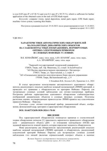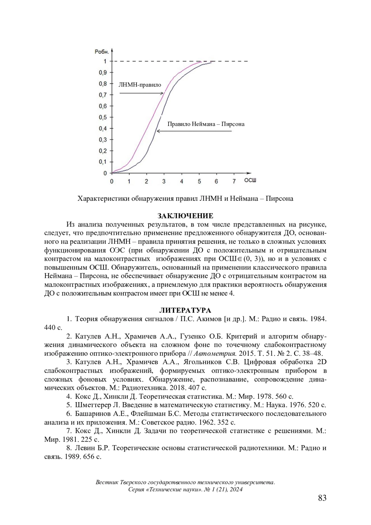 2. Катулев А.Н., Храмичев А.А., Гузенко О.Б. Критерий и алгоритм обнаружения динамического объекта на сложном фоне по точечному слабоконтрастному изображению оптико-электронного прибора // Автометрия. 2015. Т. 51. № 2. С. 38-48. EDN: TSZEWB