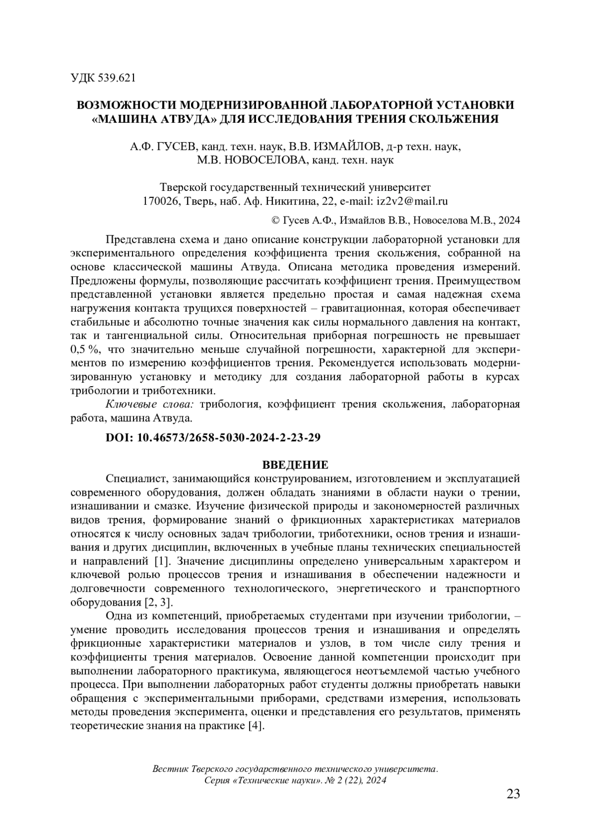 Представлена схема и дано описание конструкции лабораторной установки для экспериментального определения коэффициента трения скольжения, собранной на основе классической машины Атвуда. Описана методика проведения измерений. Предложены формулы, позволяющие рассчитать коэффициент трения. Преимуществом представленной установки является предельно простая и самая надежная схема нагружения контакта трущихся поверхностей – гравитационная, которая обеспечивает стабильные и абсолютно точные значения как силы нормального давления на контакт, так и тангенциальной силы. Относительная приборная погрешность не превышает 0,5 %, что значительно меньше случайной погрешности, характерной для экспериментов по измерению коэффициентов трения. Рекомендуется использовать модернизированную установку и методику для создания лабораторной работы в курсах трибологии и триботехники
