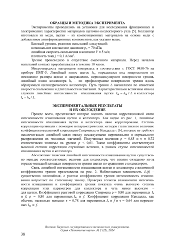 Рассмотрены корреляционные соотношения, описывающие зависимость линейной интенсивности изнашивания фрикционного контакта от коэффициента трения и твердости материалов компонентов пары трения. Соотношения получены статистической обработкой экспериментальных данных, относящихся к паре трения «щетка – коллектор». Установлена сильная корреляционная связь линейной интенсивности изнашивания компонентов пары трения с коэффициентом трения, а также обнаружена сильная положительная корреляция линейной интенсивности изнашивания с твердостью материалов щетки и коллектора, что противоречит известным результатам, свидетельствующим о возрастании износостойкости с увеличением твердости трущихся деталей. Приводится наиболее вероятное объяснение такого противоречия. Кроме того, указанная зависимость носит немонотонный характер с заметным возрастанием скорости изнашивания, если твердость материала щетки становится сравнимой с твердостью материала коллектора