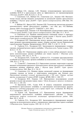 16. Горбатов П.А., Кондрахин В.П. Закономерности формирования внешней нагрузки на исполнительном органе и динамические характеристики горного комбайна // Известия вузов. Горный журнал. 1991. № 3. С. 81-95.