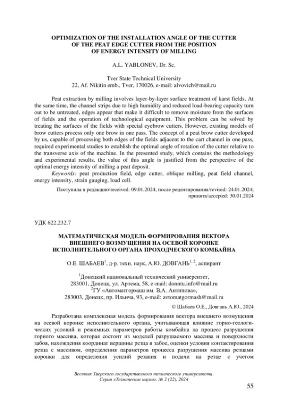 3. Семенченко А.К., Шабаев О.Е., Семенченко Д.А., Хиценко Н.В. Математическая модель вектора внешнего возмущения на аксиальной коронке проходческого комбайна // Науковi працi ДонНТУ. Серiя гiрничо-електромеханiчна. 2006. Вип. 104. С. 198-205.