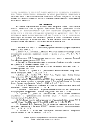 2. Болотов А.Н., Елисеева Г.С., Михалев Ю.О. Роль магнитного поля при трении поверхностей, смазанных магнитным маслом // Трение и износ. 1988. Т. 9. № 5. С. 870-878. EDN: YTKOSJ