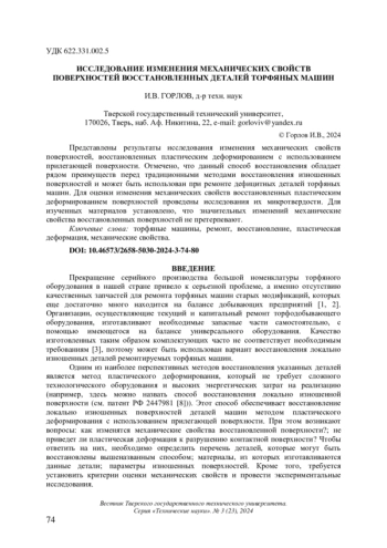 Представлены результаты исследования изменения механических свойств поверхностей, восстановленных пластическим деформированием с использованием прилегающей поверхности. Отмечено, что данный способ восстановления обладает рядом преимуществ перед традиционными методами восстановления изношенных поверхностей и может быть использован при ремонте дефицитных деталей торфяных машин. Для оценки изменения механических свойств восстановленных пластическим деформированием поверхностей проведены исследования их микротвердости. Для изученных материалов установлено, что значительных изменений механические свойства восстановленных поверхностей не претерпевают.