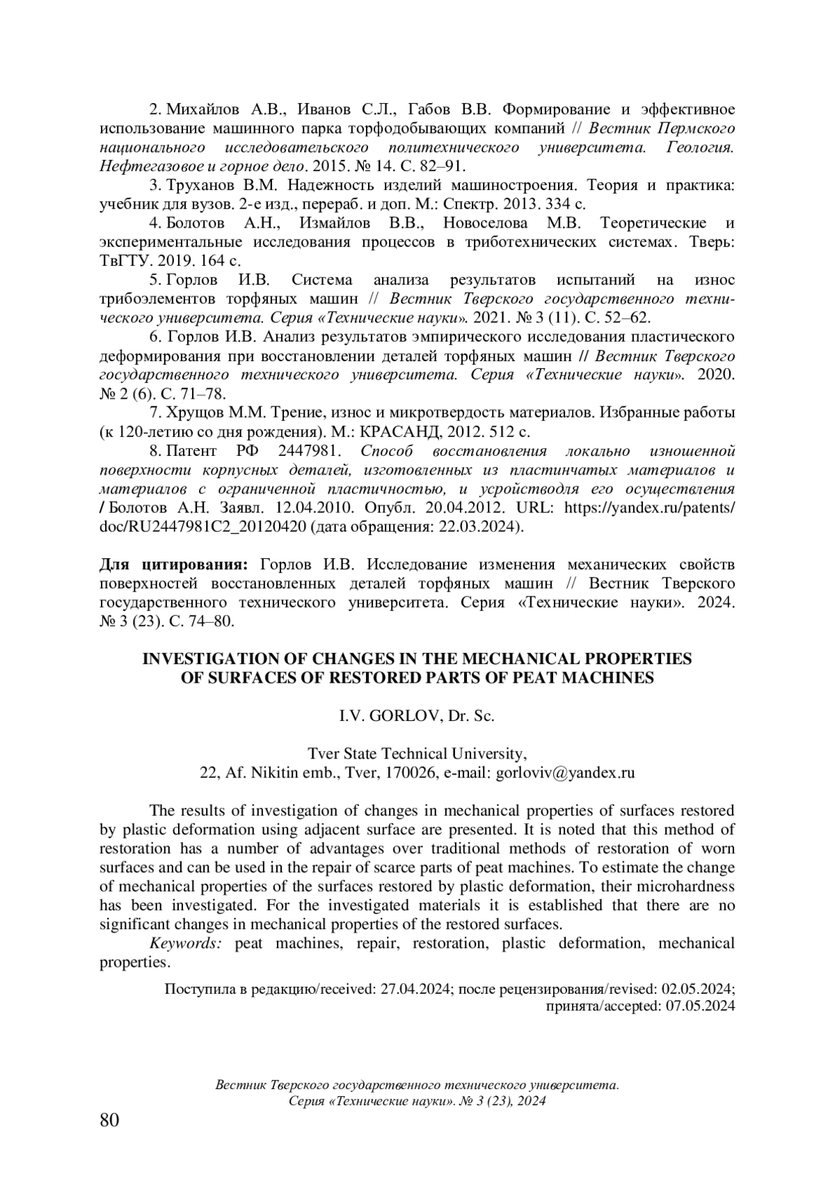 6. Горлов И.В. Анализ результатов эмпирического исследования пластического деформирования при восстановлении деталей торфяных машин // Вестник Тверского государственного технического университета. Серия “Технические науки”. 2020. № 2 (6). С. 71-78. EDN: ZKRMVT
