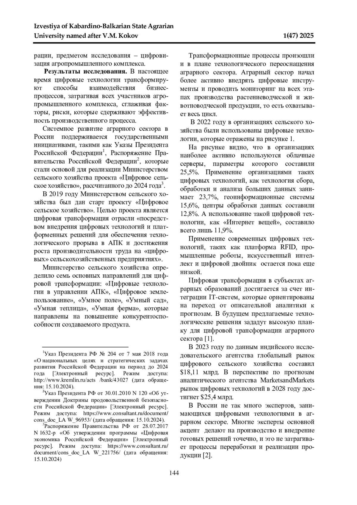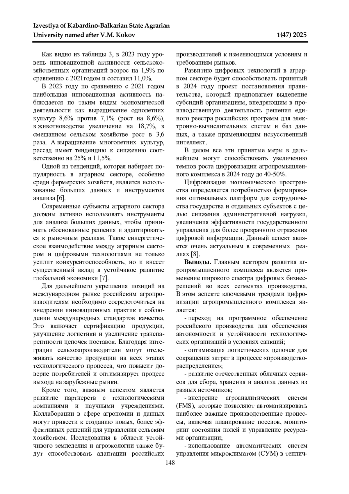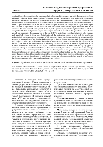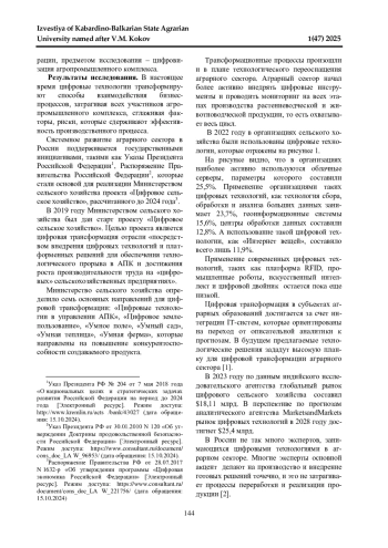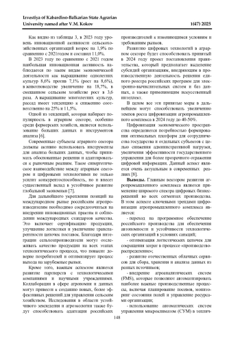 1. Этуева Э. З., Караева Ф. Е. Специфика и проблемы цифровизации АПК // Развитие современной аграрной науки: актуальные вопросы, достижения и инновации: Международная научно-практическая конференция, посвященная памяти заслуженного деятеля науки РСФСР, доктора сельскохозяйственных наук, профессора П. Г. Лучкова. Часть II. Нальчик: ФГБОУ ВО Кабардино-Балкарский ГАУ, 2024. С. 349-352. EDN: JRPRKG
