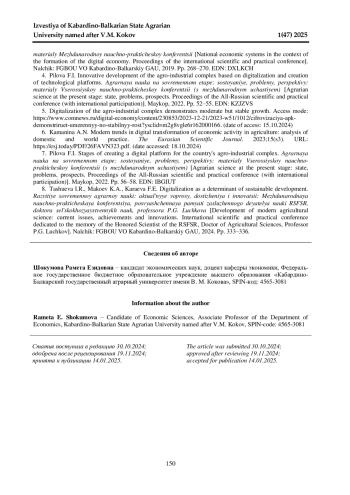 3. Бакаева З. Р. Особенности развития аграрного сектора в условиях формирования цифровой экономики // Национальные экономические системы в контексте формирования цифровой экономики: материалы Международной научно-практической конференции. Нальчик: ФГБОУ ВО Кабардино- Балкарский ГАУ, 2019. С. 268-270. EDN: DXLKCH