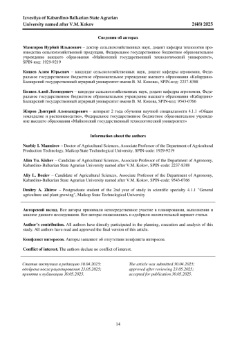 Исследование посвящено повышению урожайности кукурузы в условиях Республики Адыгея, где нестабильность урожая (около 4 т/га) связана с дефицитом подвижных форм азота и фосфора в почве. Цель работы - оценка эффективности жидких комплексных органоминеральных удобрений для увеличения продуктивности и качества зерна. Полевые опыты проводились в 2022-2024 гг. на чернозѐмах выщелоченных среднесуглинистых с использованием районированного сорта кукурузы. Изучалось влияние пяти видов удобрений (Полидон® Био, Нутривант Плюс, КомплеМет, Паверфол, Ультрамаг Комби) при различных режимах влажности. Результаты показали, что применение жидких комплексных органоминеральных удобрений в сочетании с оптимальным увлажнением значительно повышает биометрические показатели: площадь листьев увеличивалась на 7-10%, высота растений - до 322 см, а урожайность зерна достигала 8,98 т/га (2023 г.). Наибольшая эффективность отмечена при внесении 120 кг/га азота и фосфора, что обеспечило прирост сухой массы на 15-24%. В засушливые годы (2022 г.) внесение удобрений без орошения не давало существенного эффекта, что подтверждает важность комплексного подхода. Научная новизна работы заключается в изучении действия жидких комплексных органоминеральных удобрений в условиях выщелоченных чернозѐмов. Практическая ценность - разработка агротехнических рекомендаций, позволяющих стабилизировать урожайность на уровне 8-10 т/га. Исследование демонстрирует, что оптимизация минерального питания и влагообеспеченности является ключевым фактором повышения продуктивности кукурузы в регионе.