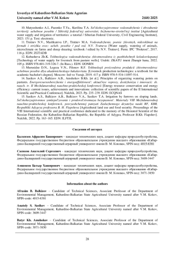 14. Принципы организации водопойных пунктов на пастбищах / А. С. Сасиков, А. Б. Балкизов, Б. Х. Амшоков [и др.] // Энергоресурсосбережение и энергоэффективность: актуальные вопросы, достижения и инновации: сб. науч. тр. II Международной научно-практической конференции. Нальчик, 2023. С. 235-239. EDN: ECQNAS