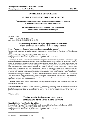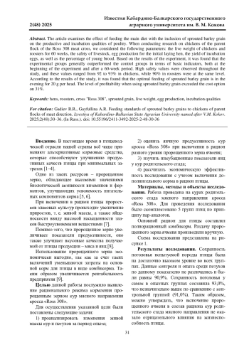 Статья: НОРМЫ СКАРМЛИВАНИЯ ЗЕРЕН ПРОРОЩЕННОГО ЯЧМЕНЯ КУРАМ РОДИТЕЛЬСКОГО СТАДА МЯСНОГО НАПРАВЛЕНИЯ (2025)