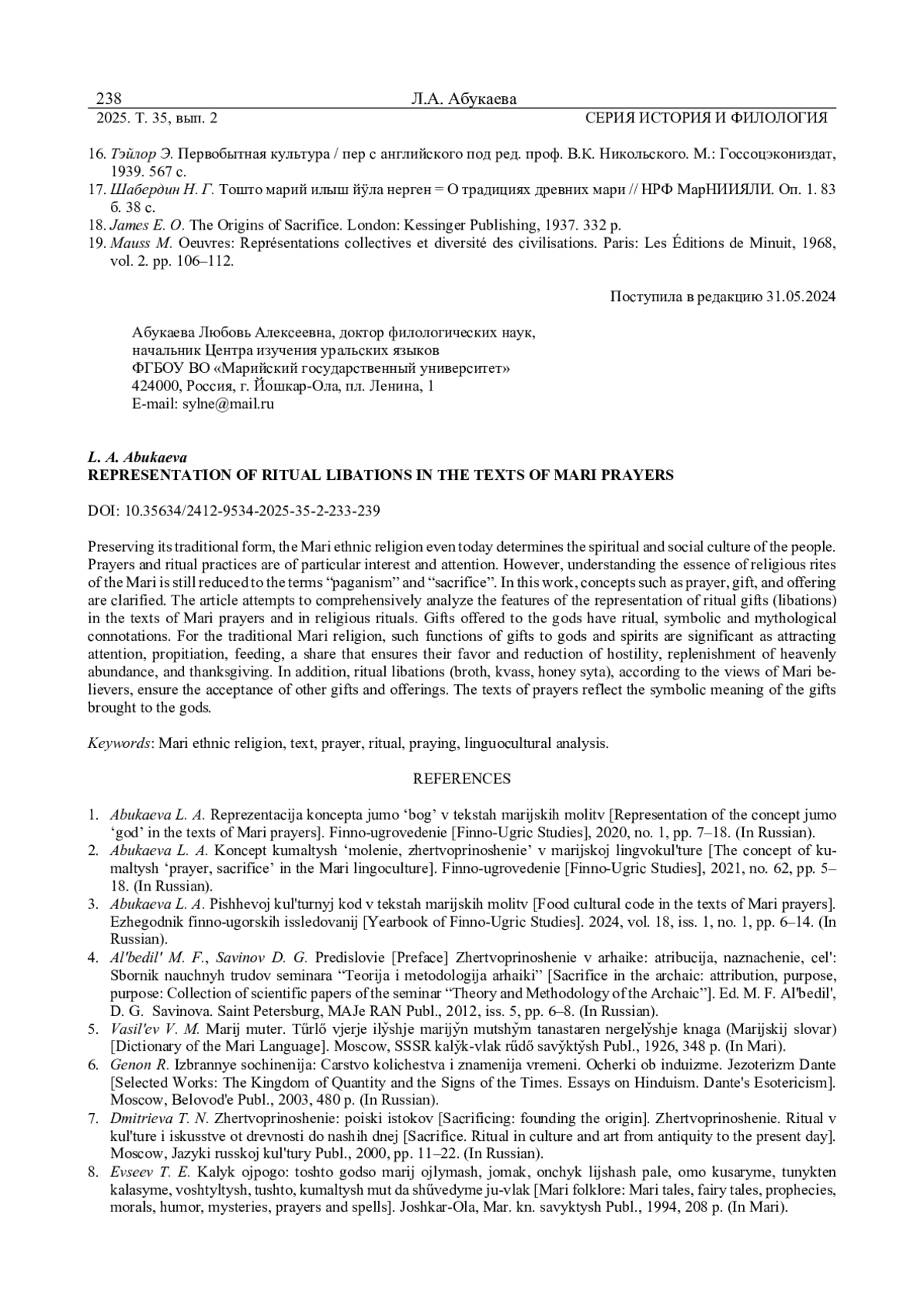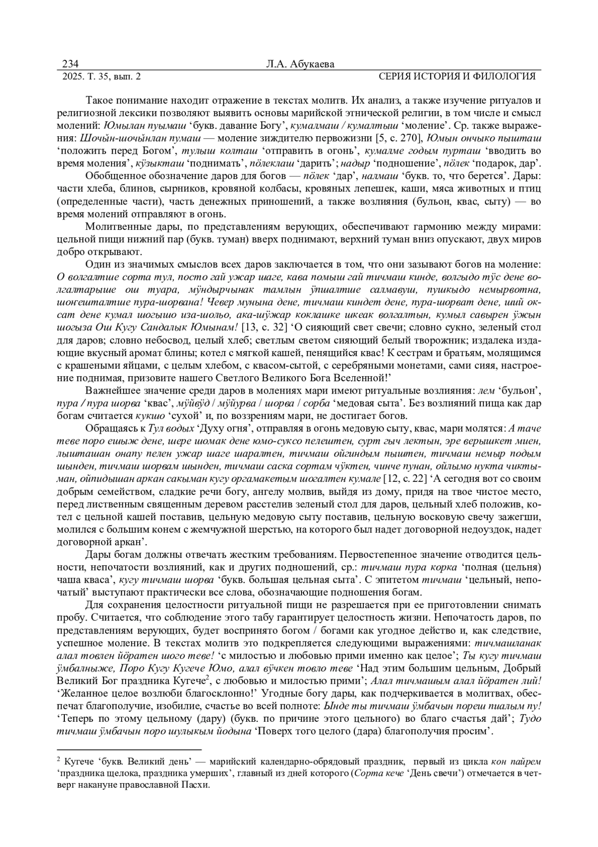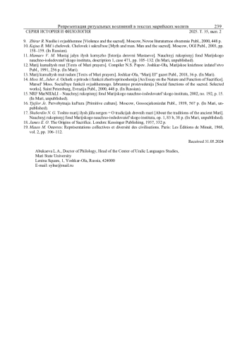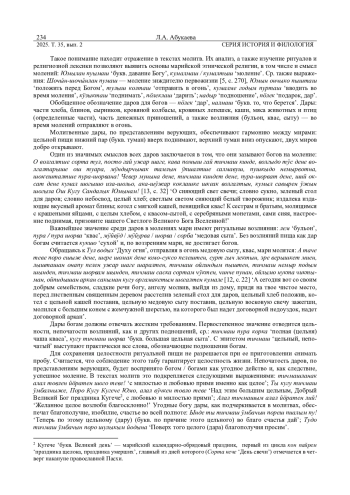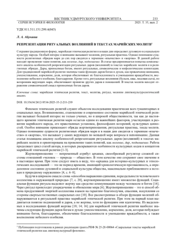АБУКАЕВА Л. А. РЕПРЕЗЕНТАЦИЯ РИТУАЛЬНЫХ ВОЗЛИЯНИЙ В ТЕКСТАХ МАРИЙСКИХ МОЛИТВ // ВЕСТНИК УДМУРТСКОГО УНИВЕРСИТЕТА. СЕРИЯ: ИСТОРИЯ И ФИЛОЛОГИЯ. 2025. Т. 35 № 2