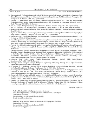 8. Жаворонкова Е. Ю. Книжный памятник как объект формирования фонда крупной библиотеки: дис. … канд. пед. наук: 05.25.03. Москва, 1998. 259 с. EDN: VTAWBF
